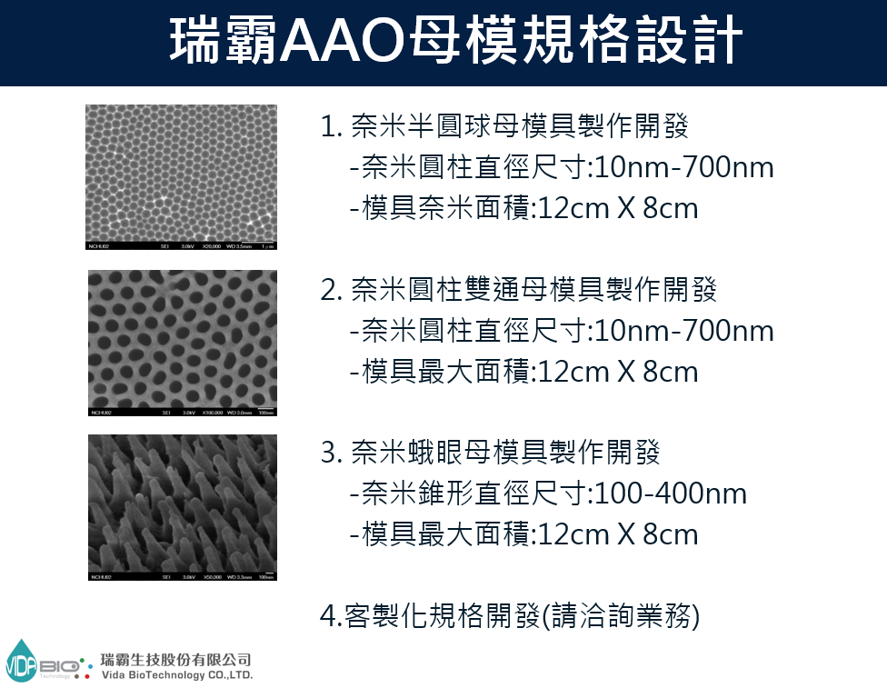 瑞霸生技有獨特技術可以在塑膠材料上轉印奈米結構,包含奈米半球、奈米凹槽、抗反射奈米角錐結構。可協助客戶開發母模設計到結構轉印等一連串開發需求。