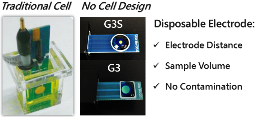 瑞霸平面金電極提供完整的金平面作為工作電極,配合網印碳做為對電極,網印氯化銀做為參考電極集合成一穩定的拋棄式電化學電極。